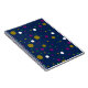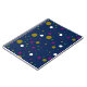 A pattern of variously sized circles in gold, white, purple, and green is scattered across a dark blue background. The circles are evenly spaced and vary in diameter.