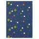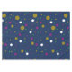 A pattern of variously sized circles in gold, white, purple, and green is scattered across a dark blue background. The circles are evenly spaced and vary in diameter.