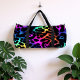 This image features a duffel bag adorned with a visually striking leopard print pattern. The spots of the leopard print are rendered in a vibrant, multi-coloured faux fur texture, showcasing a spectrum of rich hues including blues, greens, yellows, oranges, and various shades of pink and purple. These colourful, textured spots contrast sharply against the dark, likely black, background. The bag is equipped with black carrying straps. This design offers a playful yet bold statement, making it an ideal accessory for those seeking a unique and eye-catching travel or gym bag.