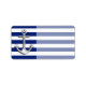 A silver chrome like anchor applique on a horizontal navy blue style stripes print decor for a perfect nautical look.