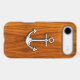 A modern nautical silver chrome like applique style on a teak wood grain decor for a custom phone case everyone on, or off the boat will enjoy.