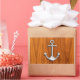A silver chrome like anchor design on a teak wood veneer grain style background decor. A modern nautical gift.