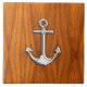A silver chrome like anchor design on a teak wood veneer grain style background decor. A modern nautical gift.