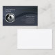 This simple elegant and professional hair stylist business card features a black background. A black hued wave streams from the left to the right, splitting the card into two sections. A circular chrome hair style icon sits on this wave, on the left side of the card, while your name and title appear on the upper left and your business name and contact details appear on the bottom right. Designed for businesses or professions related to fashion, beauty, style, clothing, cosmetics, makeup, women, ladies themes.