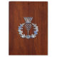 A silver chrome like Scottish thistle applique design on a classy  brown mahogany wood grain style print background for a great custom gift.
