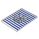 A silver chrome like wheel design on a navy blue stripes decor. A modern nautical gift.