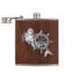A modern nautical style silver chrome like applique on a wet mahogany wood print decor for a fine custom flask gift.
