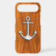 A silver chrome like anchor design on a teak wood veneer grain style background decor. A modern nautical skin.
