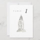 Chic wedding table number seating cards featuring a watercolor painting of New York City's Chrysler Building. The pairing of the painterly watercolor and the chic typography makes for a beautifully fun combo.