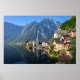 Poster print of a landscape with the church and the houses of the small village of Hallstatt in Austria, with reflection in the still water of Hallstatt lake and in the background the Alps mountains on a beautiful clear sky summer day.