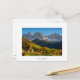 Photo postcard of the small village Sankt Magdalena with the prominent church surrounded by trees in autumn colours in front of high Dolomites mountain peaks in the last light of the day in the Villnöss (Funes) valley in South Tyrol, Italy with a white border and the text 'Italy'.