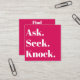 A unique red and white square business card, designed to make a lasting impression. This minimalistic card features a bold red and white colour scheme, perfectly complemented by an elegant serif typeface inspired by 19th-century European advertising posters. The front of the card boldly displays the powerful words, Ask. Seek. Knock. while the back encourages the recipient to find the promise of Matthew 7:7. With a customisable QR code, you have the opportunity to personalise a call to action above and below the code, making it ideal for promotional use for a sermon series or as a personal business card. Whether you're a minister or member of a church seeking to spread the message or an individual with a religious inclination, this card is a perfect fit. Share your faith and scripture in a stylish and impactful way. Embrace the power of this Christian-inspired business card today.