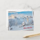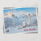 Church covered in snow with mountain background postcard