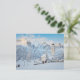 Church covered in snow with mountain background postcard