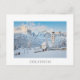 Photo postcard of the church of Colfosco covered in snow with in the background the Sella Group Dolomites mountains in a beautiful winter landscape in Alta Badia, South Tyrol, Italy with a white border and the text 'Colfosco'.