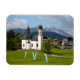 Rectangular photo magnet of the characteristic church of Seefeld village with the Alps mountains in the background. It is a holiday and ski resort in Tyrol in Austria.