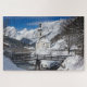 Photo jigsaw puzzle with the famous St. Sebastian church in the snow backed by high Alps mountains with a bridge and a small brook in Ramsau b. Berchtesgaden, near Austria in Germany in winter.