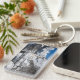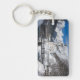 Photo keychain with the famous St. Sebastian church in the snow backed by high Alps mountains with a bridge and a small brook in Ramsau b. Berchtesgaden, near Austria in Germany in winter.