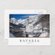 Photo postcard of the famous St. Sebastian church in the snow backed by high Alps mountains with a bridge and a small brook in Ramsau b. Berchtesgaden, near Austria in Germany in winter with a white edge and a box with the text "Bavaria, Germany". It has lines in black, red and yellow, the colours of the german flag.