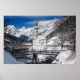 Poster print of the famous St. Sebastian church in the snow backed by high Alps mountains with a bridge and a small brook in Ramsau b. Berchtesgaden, near Austria in Germany in winter.