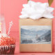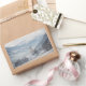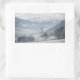 Rectangular photo sticker with the church of St. Pankraz in an alpine landscape in the snow surrounded by clouds and fog on a hill with a view over Zillertal valley with the Alps mountains in the background in Fügen, Austria in winter.
