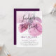 A modern invitation perfect for a church ladies' retreat, conference, or event. This design has an oversize purple watercolor orchid flower as the main feature, overlaid with the phrase "ladies' retreat" (which can be edited) in sophisticated hand lettered black font, and event details (including event theme, guest speaker etc.) in black and purple at the bottom third of the invitation. The back of the invitation is in rich dark purple.
