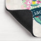 A mouse pad with customisable text which says: "Ciao Bella" written in curved text inside a blue green ribbon layered over top a whimsical heart filled with tropical flowers and leaves in pink, green and yellow colours.