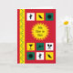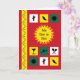 "Happy Fifth of Mayo" = "Happy Fifth of May." The design of this card is inspired by the joys of Mexico. The colors are green, red and white for the Mexican flag, with the addition of a bright sunshine yellow. The background is red, with a sunburst in the middle and a zig-zag standard stripe on the left hand side. The pattern of nine colored squares contains Mexican-themed icons in silhouette: cactus, chili, sun, cocktail glass, sombrero and maracas.