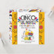 Festive holiday invitation for Cinco de Mayo with gold border with a floral Mexican folk pattern with a tequila, maracas, and sombrero.