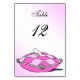 A double-sided table card with vintage art of Cinderella's Slipper on a pink and white pillow against a background of pink and white with elegant script letters. Customise It to add your image, change fonts, letter colours and more, even save your design for later.