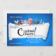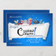 This invitation has a bright blue background with a tear-off section that reveals the words "Cinema Party!". The top border features movie tickets, 3-D glasses, a soda cup, a movie reel, popcorn and a clapboard. Perfect for a movie night and a cinema party for all ages.
