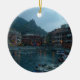 This ornament features a photograph of a beautiful little harbour in Cinque Terre, Italy at dusk. The boats have come in for the evening and the street lamps have been turned on, illuminating the pink and yellow buildings. The sea in the foreground and mountains in the background have become dark, while the still blue sky is growing dim.