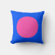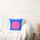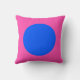 A pillow with a minimal abstract circle design in Hot Pink and Blue. The colours alternate on each side.