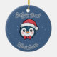 Featuring a cheerful penguin in a Santa hat and bow tie with snowy accents, this circle-shaped ceramic ornament is a timeless keepsake.