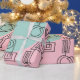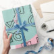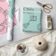 This wrapping paper has a mid-century modern design inspired by Kandinsky of a circle of shapes formed by one continuous black line with seafoam and pink shapes as a background. If you like the design but prefer different colours, message me.