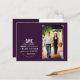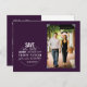 Announce your special day with this simple, modern purple save the date postcard featuring a circle with white text and a photo in grey photo corners. No need to crop your photo, just slip it in behind the purple background and you are good to go. The photo corners and purple background are removable. Custom colour schemes are available upon request.