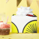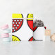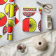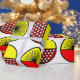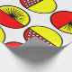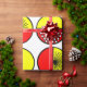 This wrapping paper has a mid-century modern design of half-circles, some with starbursts, some with small circles, and some just solid, in red and yellow.