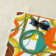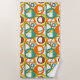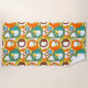 This beach towel has a mid-century modern design of circles and semi-circles in orange, yellow, green, brown, and turquoise on a field of white. If you want the same design with different colours, message me.