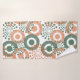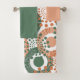 This towel set has a coral washcloth, a green hand towel, and a bath towel with a design of circles decorated with lines and circles made of repeating dots in retro green and coral