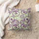 This throw pillow has a geometric design of circles decorated with lines and circles made of repeating dots in eggplant and green.