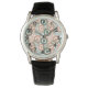 This men's watch has a design of circles decorated with lines and circles made of repeating dots in retro green and coral.