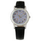 This women's watch has a geometric design of circles in rows with circles or ovals inside in brown on a field of blue.