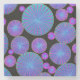 Groovy psychedelic pattern in neon colours. A vibrant design with both big and small round wheels containing concentric rings with spokes. Colours include vivid bright pink, sky blue, turquoise blue, violet and purple. Has a wonderful sense of motion, movement and fun.