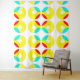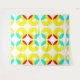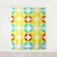 Rings rotate within rings over vivid yellow, aqua and red circles on a white background.
