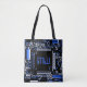 Modern design featuring a close up of a computer circuit board in blue, black and white. Bag with a customisable design for you to personalise with your own text, pictures and ideas. Created using an original photograph and digital techniques by Jess Perry.