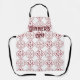 This apron has a mid-century modern design of rounded squares with lines and circles in rose and rust inside that look like circuit chips.