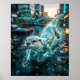 A playful circuit otter glides through a futuristic harbor stream, built from sleek waterproof plating, glowing whisker lines, and luminous streamlined contours. Cyan, silver, teal, and amber tones shimmer across its agile body as water splashes in motion. Floating docks, harbor lights, moored vessels, reflective canals, soft rain, and skyline towers create a lively urban waterscape. This charming aquatic design blends fun personality with modern technology, perfect for bedrooms, offices, kids spaces, and gifts for otter lovers.