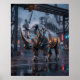 A colossal circuit rhino stands with unstoppable force in a futuristic industrial zone. Its body is built from titanium armour plating, glowing hydraulic lines, and illuminated seams that highlight massive strength and weight. Neon orange, cyan, and steel blue energy pulses through the mechanical structure while factories, pipes, cranes, steam, and wet pavement create a gritty cinematic backdrop. This bold rhino design is ideal for offices, gaming setups, modern interiors, and collectors who love power-themed futuristic wildlife.