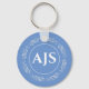 Keyring has a design in blue and white with a monogram. Attractive idea that can be personalised. Key fob with initials.
