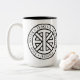 This design is an ancient adaptation of the circular ichthys which contains the Greek letters superimposed such that the result resembles an eight-spoked wheel.